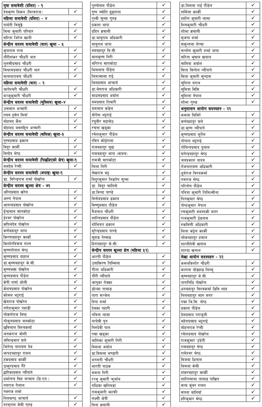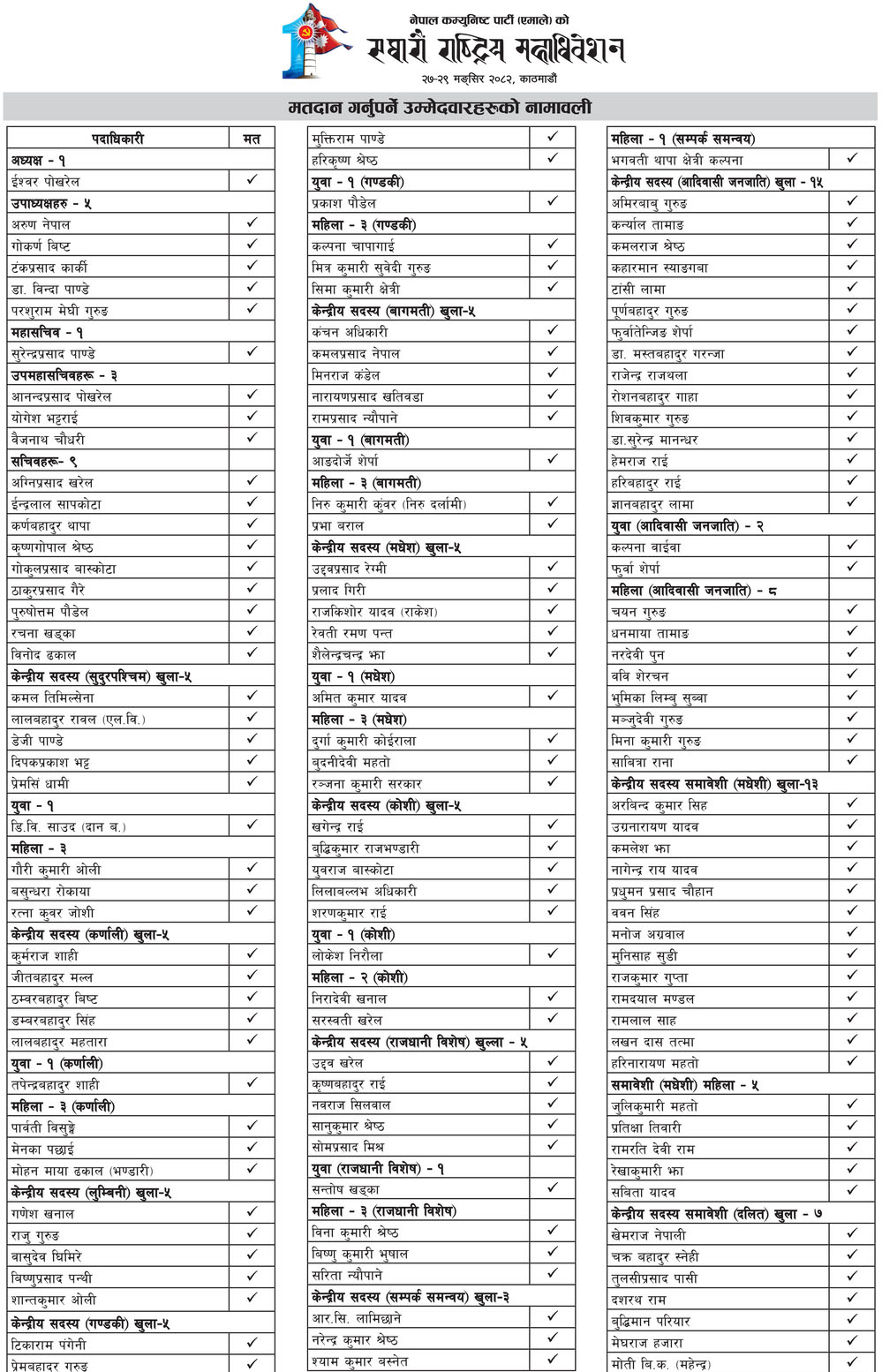 सूचीअनुसार अध्यक्षमा पोखरेल, उपाध्यक्षमा अरुण नेपाल, गोकर्ण विष्ट, टंकप्रसाद कार्की, विन्दा पाण्डे, परशुराम मेघी गुरुङ, महासचिवमा सुरेन्द्रप्रसाद पाण्डे, उपमहासचिवहरुमा आनन्दप्रसाद पोखरेल, योगेश भट्टराई, वैजनाथ चौधरी उम्मेदवार छन् ।