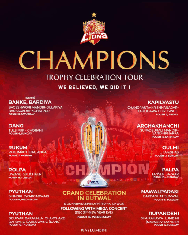काठमाडौँ । नेपाल प्रिमियर लिग एनपीएल क्रिकेट २०२५ को विजेता लुम्बिनी लायन्सले ‘च्याम्पियन्स ट्रफी सेलेब्रेसन टूर’ आउँदो शनिबारदेखि सुरु गर्न लागेको छ ।
