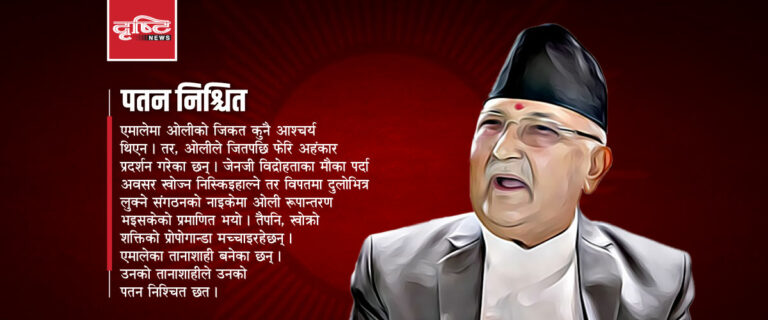 एमालेमा ओलीको जिकत कुनै आश्चर्य थिएन । तर, ओलीले जितपछि फेरि अहंकार प्रदर्शन गरेका छन् । सत्तामा फेरि पुग्ने लालसा देखाएका छन् । जेनजी विद्रोहताका मौका पर्दा अवसर खोज्न निस्किइहाल्ने तर विपतमा दुलोभित्र लुक्ने संगठनको नाइकेमा ओली रुपान्तरण भइसकेको प्रमाणित भयो । तैपनि, ओली खोक्रो शक्तिको प्रोपोगान्डा मच्चाइरहेछन् । एमालेका तानाशाही बनेका छन् । उनको तानाशाहीले उनको पतन निश्चित छ । योसँगै एमाले पनि पतनको बाटोमा द्रुत गतिमा बढ्दैछ । ओलीको तानाशाहलाई सदर गरेसँगै एमाले अर्को राजनीतिक दुर्घटनामा पर्ने देखिन्छ ।
