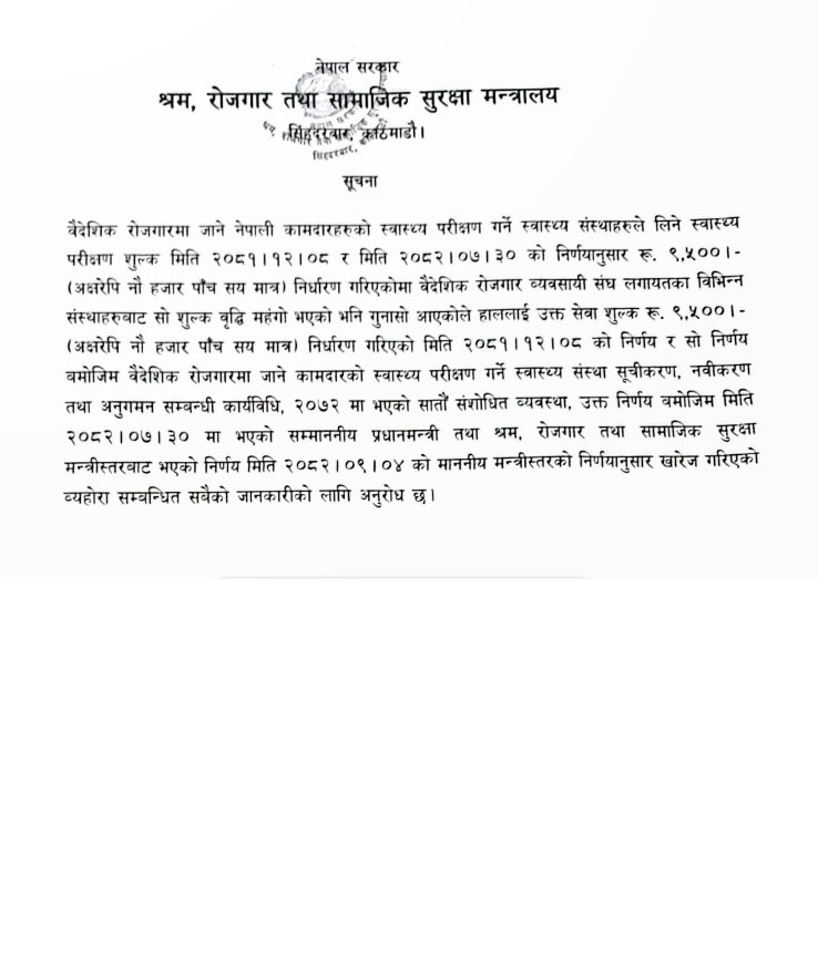 काठमाडौं । वैदेशिक रोजगारीमा जानेहरूको स्वास्थ्य परीक्षण शुल्क वृद्धि खारेज गरिएको छ । श्रम, रोजगार तथा सामाजिक सुरक्षा मन्त्रालयले सूचना जारी गर्दै शुल्क वृद्धि खारेज गर्दै पुरानै यथावत् राखिएको जानकारी दिएको हो ।