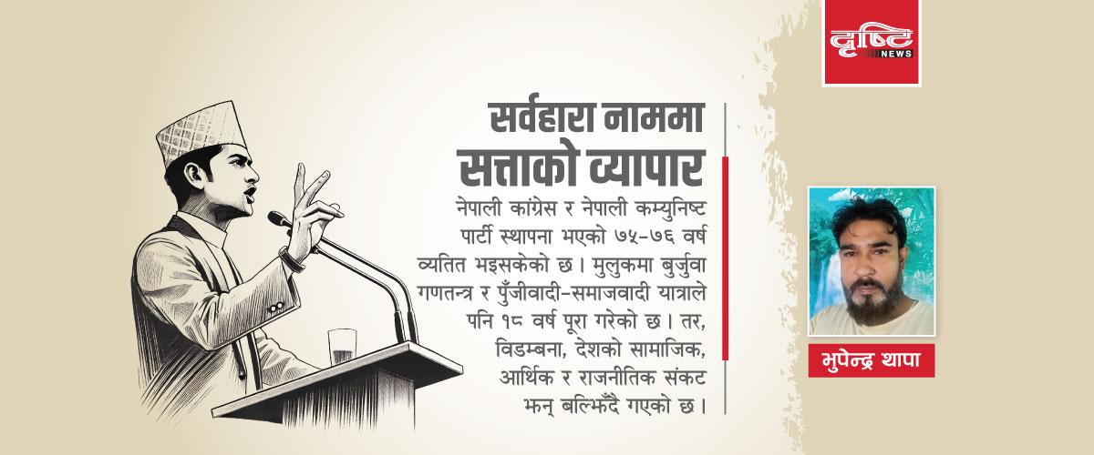 नेपालमा पुँजीवादी विचारधारा अँगालेको नेपाली कांग्रेस र समाजवाद हुँदै साम्यवादको लक्ष्य राखेको कम्युनिष्ट पार्टी स्थापना भएको ७५–७६ वर्ष व्यतित भइसकेको छ । मुलुकमा बुर्जुवा गणतन्त्र र पुँजीवादी–समाजवादी यात्राले पनि १८ वर्ष पूरा गरेको छ । तर, विडम्बना, देशको सामाजिक, आर्थिक र राजनीतिक संकट झन् बल्झिँदै गएको छ ।