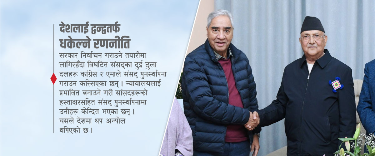 सरकार निर्वाचन गराउने तयारीमा लागिरहँदा विघटित संसद्का दुई ठुला दलहरू कांग्रेस र एमाले संसद् पुनस्र्थापना गराउन कस्सिएका छन् । न्यायालयलाई प्रभावित बनाउने गरी सांसदहरूको हस्ताक्षरसहित संसद् पुनस्र्थापनामा उनीहरू केन्द्रित भएका छन् । यसले देशमा थप अन्योल थपिएको छ । निर्वाचनको मिति तोकिएको अवस्थामा संसद् पुनस्र्थापनाको चर्चाले निर्वाचनको वातावरण बिथोलिने हो कि भन्ने आशंका छ ।