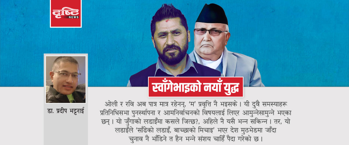 जे भए पनि यो स्वाँगे–भाइ लडाइँ फेरि एकपटक नयाँ सिराबाट सुरु भएको छ । यो लडाइँमा कसको जीत र कसको हार हुन्छ ? अहिले नै केही भन्न सकिने अवस्था छैन । यद्यपि, एउटा कुरा चाहिँ तय छ कि यी कसैले जिते पनि नेपाल र नेपालीको हार नै हुन्छ । लोकरिझ्याइँवादका यी नयाँ बादसाहहरू अब पात्र मात्र रहेनन् प्रवृत्ति नै भइसके । मै खाऊँ, मै मात्र लाऊँ भन्ने यो प्रवृत्ति स्वयंमा समस्या हो, समाधान हैन ।