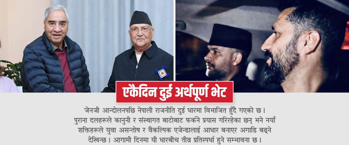 एकातिर परम्परागत राजनीतिक शक्ति केन्द्रमा रहेका एमाले अध्यक्ष केपी शर्मा ओली र कांग्रेस सभापति शेरबहादुर देउवाबीचको भेट, अर्कोतिर वैकल्पिक राजनीतिक धारका प्रतिनिधि मानिएका राष्ट्रिय स्वतन्त्र पार्टी (रास्वपा)का सभापति रवि लामिछाने र काठमाडौं महानगरपालिकाका मेयर बालेन शाहबीचको लामो संवाद । यी दुवै घटनाले नेपाली राजनीतिमा दुई स्पष्ट धारा एकसाथ सक्रिय भएको संकेत दिएको छ ।