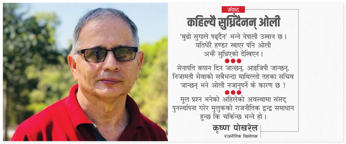 सरकारलाई चेतावनी दिनुको अर्थ के हो भने आक्रमण नै प्रतिरक्षाको सर्वोत्तम उपाय हो भन्ने नै हो । ‘मबाट गल्ती भयो, मैले सरकार चलाउन जानिनँ, बालुवाटारबाट हेलिकप्टर चढेर भाग्नुप¥यो’ भन्यो भने त झन् खेदिने अवस्था आउँछ भनेर ओलीले चेतावनीको भाषा बोल्नुभएको हो । त्यसकारण उहाँले ‘मैले जे गरेको थिएँ, ठिक थियो’ भनेर आक्रामक ढंगले अघि आयो भने मूल एजेन्डाबाट सबैको ध्यान भड्किएर आफ्नो भनाइतिर जान्छ भन्ने उहाँको सोच हो । ओलीले जेनजी आन्दोलनलाई राम्रोसँग बुझ्न नसक्दा राज्य असफल हुने स्थिति जसरी आयो, त्यो त ओलीकै नेतृत्वमा भएको हो । त्यसकारण भदौ २३ र २४ को घटनाबाट ओली पन्छिन मिल्दैन । ओलीले राजीनामा गर्दा पनि उहाँ नै कामचलाउ प्रधानमन्त्री हुनुहुन्थ्यो । म हुँदासम्म सिंहदरबारमा आगो लागेको थिएन भनेर उम्कने ठाउँ ओलीलाई छैन । कामचलाउ प्रधानमन्त्री ओली नै भएकाले उहाँले त्यसको जिम्मेवारी लिनुपर्छ नै । तर, उहाँ अहिले पनि चेतावनी र धम्कीको भाषा प्रयोग गरिरहनुभएको छ । त्यसैले उहाँले एमालेलाई सही दिशामा अगाडि बढाउन सक्ने देखिँदैन ।