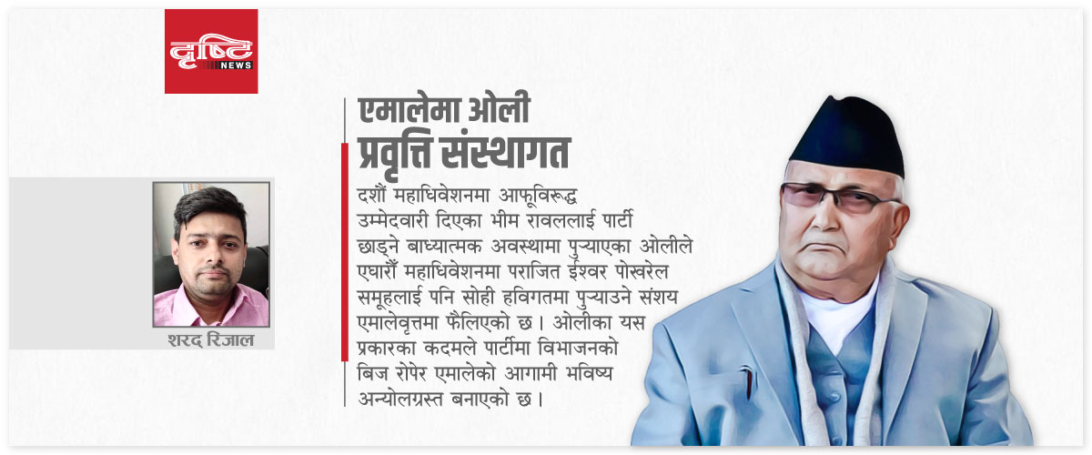अहिले उनले पार्टीभित्र आफूलाई चुनौती दिँदै महाधिवेशनमा उम्मेदवारी दिने नेताहरूप्रति पुरानै तुष कायमै राखेर बाहिरिन बाध्य पार्ने चलखेल सुरु गरिसकेका छन् । दशौं महाधिवेशनमा आफूविरुद्ध उम्मेदवारी दिएका भीम रावललाई पार्टी छाड्ने बाध्यात्मक अवस्थामा पु¥याएका ओलीले एघारौँ महाधिवेशनमा पराजित ईश्वर पोखरेल समूहलाई पनि सोही हविगतमा पु¥याउने संशय एमालेवृत्तमा फैलिएको छ । ओलीका यस प्रकारका कदमले पार्टीमा विभाजनको बिज रोपेर एमालेको आगामी भविष्य अन्योलग्रस्त बनाएको छ ।