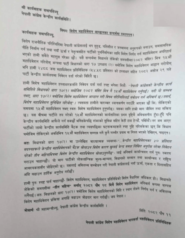 नेता देवराज चालिसेले नियमित महाधिवेशन नहुने अवस्थामा विशेषको विकल्प नभएको जनाउँदै कार्यवाहक सभापति पूर्णबहादुर खड्कालाई स्मरण पत्र बुझाएका हुन् ।