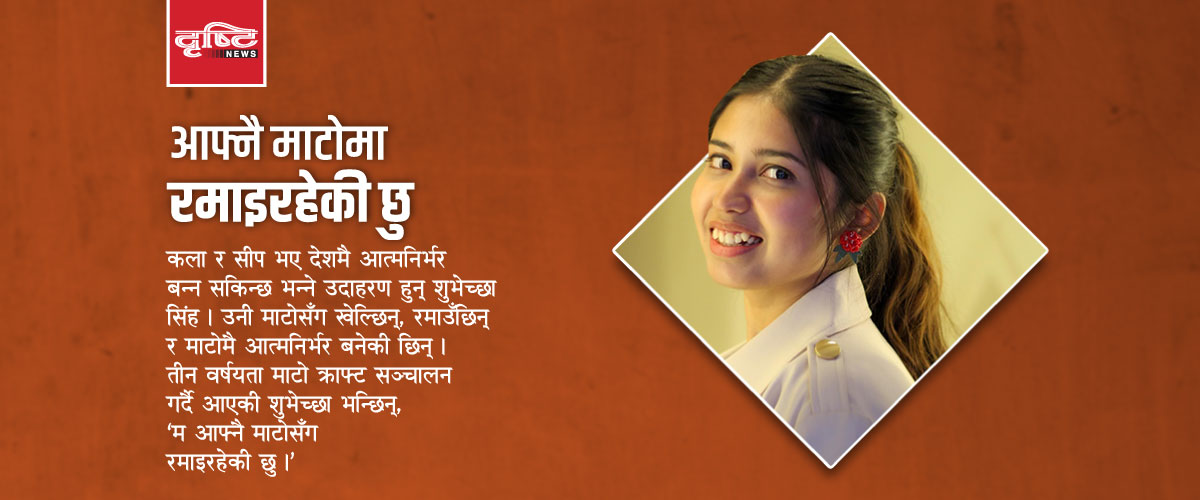 कला र सीप भए देशमै आत्मनिर्भर बन्न सकिन्छ भन्ने उदाहरण हुन् शुभेच्छा सिंह । उनी माटोसँग खेल्छिन्, रमाउँछिन् र माटोमै आत्मनिर्भर बनेकी छिन् । तीन वर्षयता माटो क्राफ्ट सञ्चालन गर्दै आएकी शुभेच्छा भन्छिन्, ‘म आफ्नै माटोसँग रमाइरहेकी छु ।’ उनी एक प्रकारको कृत्रिम माटोबाट विभिन्न डिजाइनका झुम्का, टप तथा सौन्दर्य र सजावटका सामग्री बनाउँछिन् । पाँच हजार रुपैयाँ लगानीमा सुरुवात गरेको उनको यो व्यवसायको हाल ब्राण्ड भ्यालु ५० लाख पुगेको छ । शुभेच्छाको यो व्यवसायी विदेशसम्म फैलिएको छ । उनी भन्छ्नि, ‘देश–विदेशबाट अर्डर आइरहेको छ । अहिले मलाई भ्याइनभ्याइ छ ।’ सानैदेखि ‘विजनेश वुमन’ बन्ने सपना र लक्ष्य लिएकी २२ वर्षीया शुभेच्छा हाल कम्युटर साइन्समा स्नातकका साथै टेक्नोलोजीमा चौथौ वर्षमा अध्ययनरत छिन् । उनै ‘माटो क्राफ्ट’की सञ्चालक शुभेच्छा सिंहसँग दृष्टि संवाददाताको जम्काभेट ।