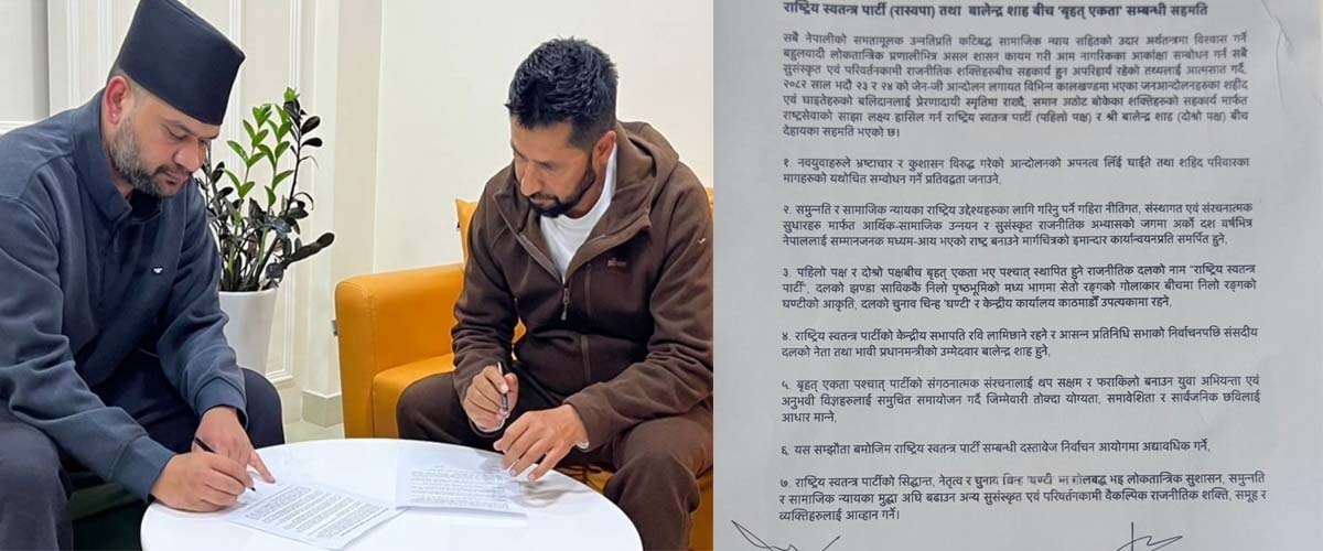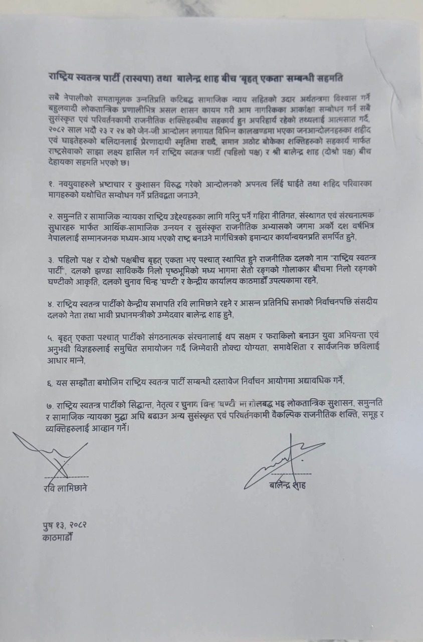 सम्झौतापत्र अनुसार, रवि लामिछानेले राष्ट्रिय स्वतन्त्र पार्टीको नेतृत्व गर्नेछन् भने आगामी प्रधानमन्त्रीको उम्मेद्वारका रुपमा बालेन शाहलाई संसदीय दलको नेताको रुपमा उभ्याइनेछ ।