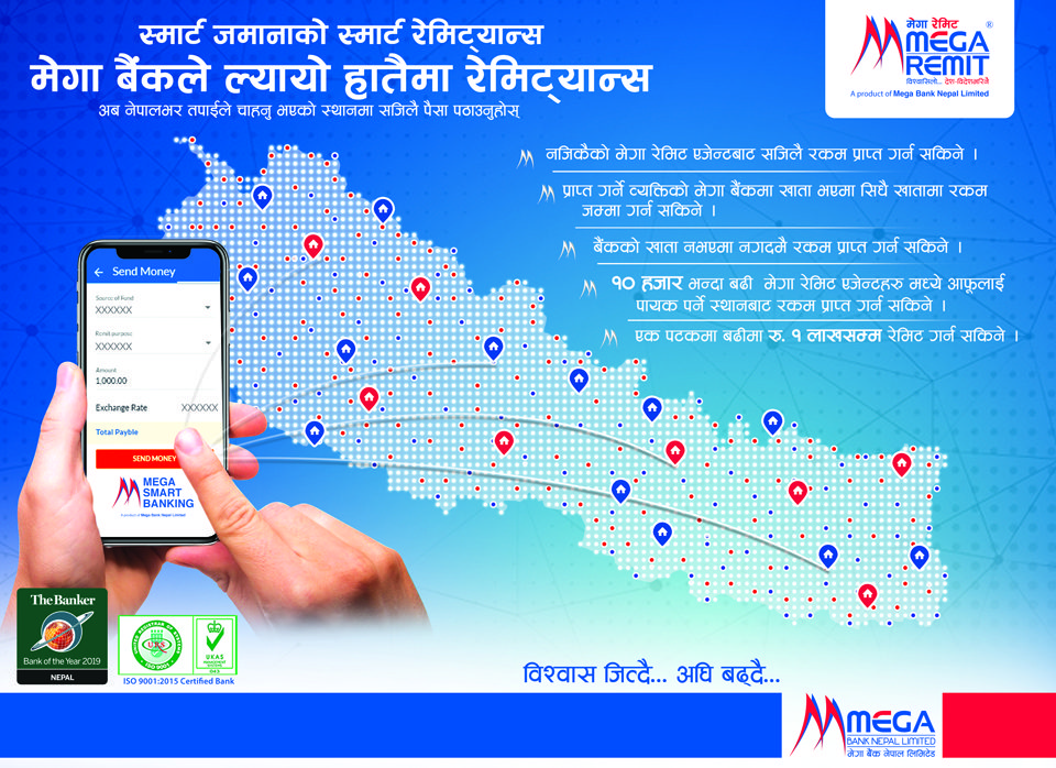 काठमाडौँ, २९ असोज । मेगा बैंक नेपाल लिमिटेडले ‘मेगा रेमिट’ सेवालाई अत्याधुनिक रुपमा विकास गरेको छ । स्मार्ट रेमिट्यान्स सेवा प्रदान गर्ने उद्देश्यले मेगा बैंकले मोबाइलबाटै रेमिट्यान्स पठाउन मिल्ने गरी अत्याधुनिक सेवा प्रारम्भ गरेको हो । रेमिट केन्द्रहरुमा नपुगी आफैले मोबाइलबाट सिधै रकम रेमीट गर्न सकिने हुँदा यसलाई ‘हातैमा रेमिट्यान्स’ भन्ने नाम दिइएको छ ।