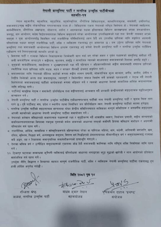 सोमबार पार्टी एकतासम्बन्धी १० बुँदे सहमति पत्रमा नेकपाका संयोजक पुष्पकमल दाहाल ‘प्रचण्ड’, सहसंयोजक माधवकुमार नेपाल र नागरिक उन्मुक्ति पार्टीकी अध्यक्ष श्रेष्ठले हस्ताक्षर गरेका हुन् ।