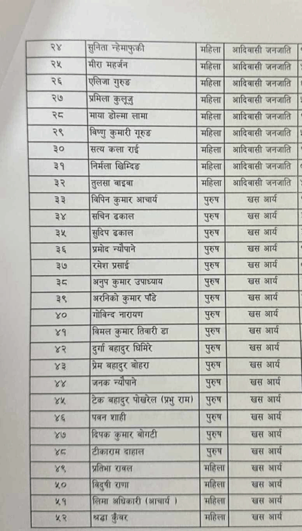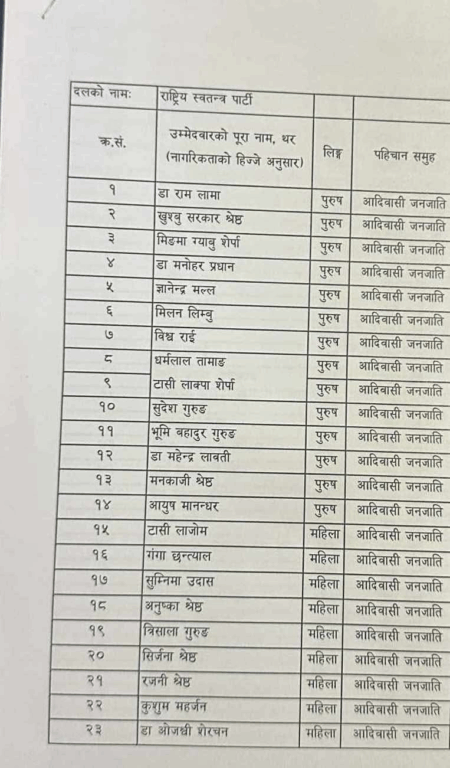 रास्वपा, बालेन शाह र घिसिङको सूचीलाई मिलाएर रास्वपाले आयोगमा दर्ता गरेको हो । आदाीवासी जनजातीतर्फ सूचीको पहिलो नम्बरमा डा राम लामा पर्दा दोस्रोमा खस्बु सरकार श्रेष्ठ र युवा नेता मिलन लिम्बू ६ नम्बरमा परेका छन् ।