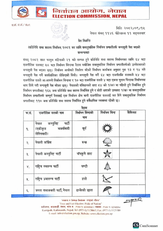आयोगका अनुसार ६४ वटा राजनीतिक दलबाट ५८ वटा निर्वाचन चिह्नमा चुनाव लड्ने गरी समानुपातिक उम्मेदवारको बन्दसूची पेस भएको हो । आयोगले १० वटा दलले ४ वटा एकल चुनाव चिह्नमा निर्वाचनमा भाग लिने गरी बन्दसूची पेस गरेका छन् ।