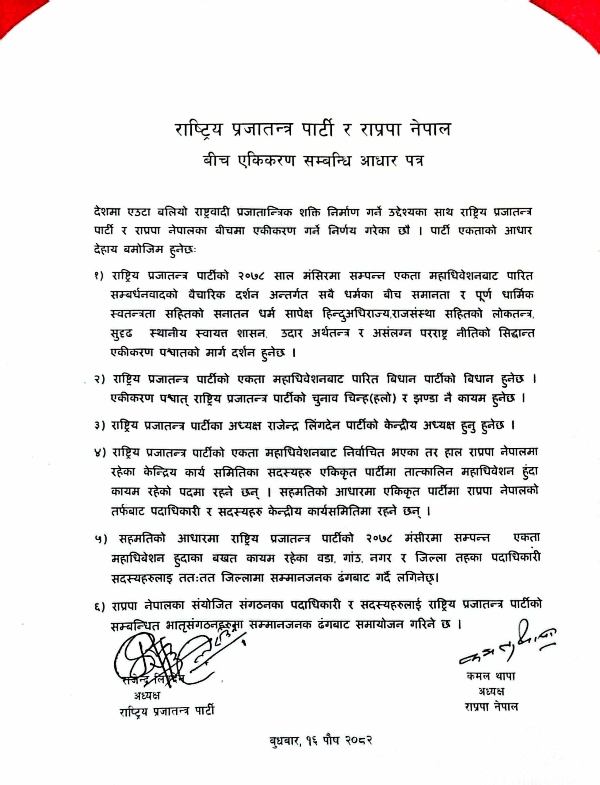 सहमति पत्रमा राप्रपाका तर्फबाट अध्यक्ष राजेन्द्र लिङ्देन र राप्रपा नेपालका तर्फबाट अध्यक्ष कमल थापाले हस्ताक्षर गरेका छन्। पार्टीको नाम राप्रपा नै रहनेछ ।
