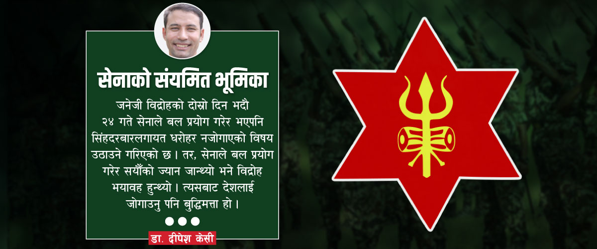 सेनाले राजनैतिक संकट पार लगाउन विगत देखि वर्तमानमा समेत सहजीकरण गर्दै आएको छ । माओवादीलाई शान्ति प्रक्रियामा ल्याउने वातावरण बनाएको २०६३ सालको परिवर्तनमा सेनाले सहजीकरणको भूमिका खेलेको थियो । त्यो भूमिका जेनजी विद्रोहपछिको राजनीतिक शून्यतामा पनि खेल्यो । राजनीतिक शून्यतामा सेनामा महत्वाकांक्षा हुन्थ्यो भने शासन नै हातमा लिने थियो होला । तर, सेनाले त्यसो गरेन । सत्ताको संघर्षमा लागेर बदनाम हुने र राष्ट्रिय सुरक्षाको कर्तव्यबाट अन्यत्र मोडिएन । सेनामा वर्तमानको क्षणिक सत्ता स्वादभन्दा देशहितको भविष्यप्रतिको दुरदृष्टि रह्यो ।