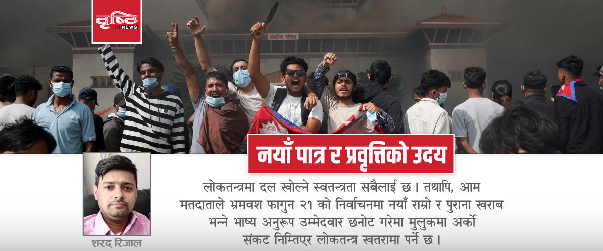 विश्वविख्यात दार्शनिक एरिस्टोटलले भनेका थिए-‘प्रजातन्त्र विकृत भयो भने त्यसबाट तानासाह जन्मिन्छ ।’ नेपालको राजनीतिमा प्रजातन्त्र तथा लोकतन्त्रको आवरणमा व्याप्त नेतातन्त्र र दलतन्त्रको भ्रष्टाचार, दण्डहीनता, नातावाद र कृपावादले जेनजी विद्रोह निम्तियो । त्यसले संघर्षशील राजनीतिक इतिहास बोकेका दलहरू असक्षम साबित भए । यसले आगामी निर्वाचनमार्फत दूरगामी प्रभावस्वरुप अनेकौँ अराजनीतिक चरित्रका पात्र र प्रवृत्ति हाबी हुने परिदृश्य अहिले हामी देखिरहेका छौँ ।