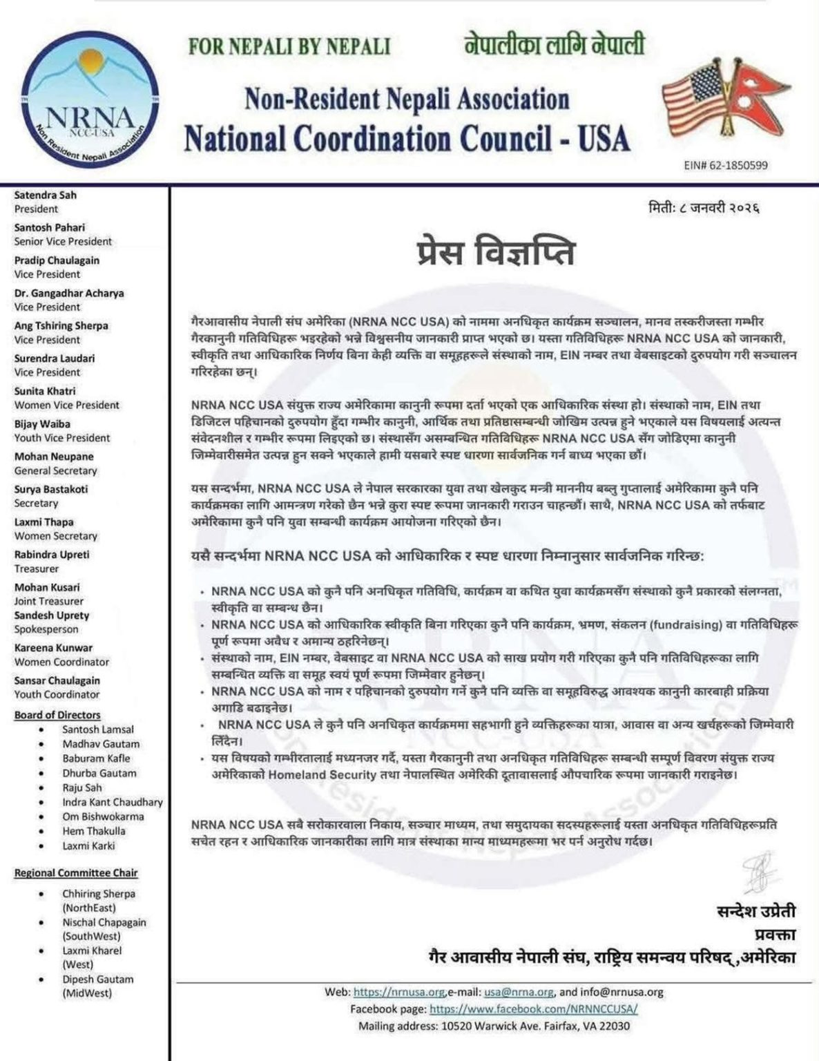 ‘गैर आवासीय नेपाली संघ, राष्ट्रिय समन्वय परिषद्, अमेरिकाको आधिकारिक स्वीकृति बिना गरिएका कुनै पनि कार्यक्रम, भ्रमण, संकलन (फन्डराइजिङ) या गतिविधिहरू पूर्ण रूपमा अवैध र अमान्य ठहरिने छन्,’ विज्ञप्तिमा भनिएको छ ।
