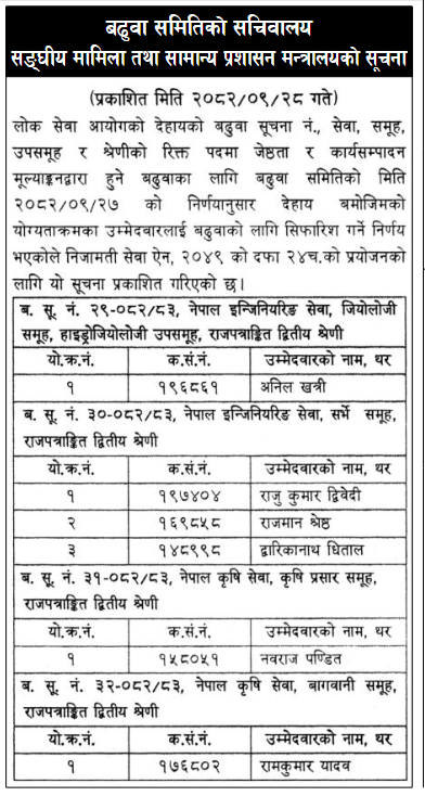 बढुवा सिफारिस हुनेमा नेपाल इन्जिनियरिङ सेवा, जियोलोजी समूह, हाइड्रोजियोलोजी उपसमूह, राजपत्रांकित द्वितीय श्रेणी (उपसचिव) पदका लागि अनिल खत्री रहेका छन् । यस्तै, सर्भे समूह राजपत्रांकित द्वितीय श्रेणीअन्तर्गत राजु कुमार द्विवेदी, राजमान श्रेष्ठ र द्वारिकानाथ धिताल रहेका छन् ।