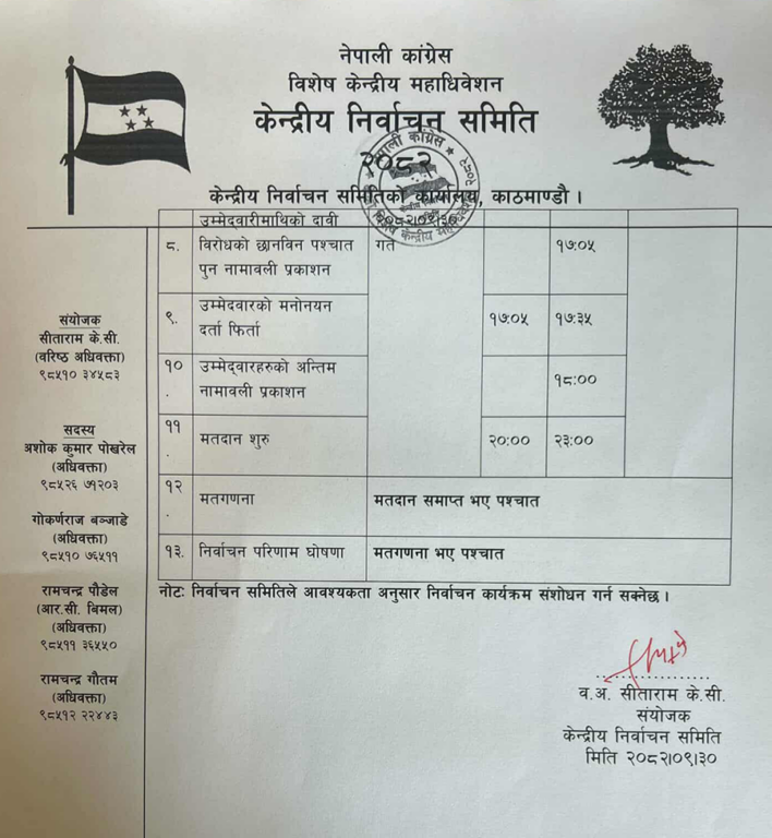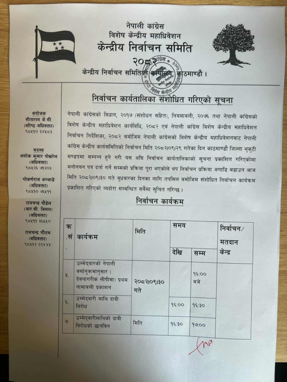 काठमाडौं । नेपाली कांग्रेसको विशेष केन्द्रीय महाधिवेशन निर्वाचन समितिले निर्वाचनको संशोधित कार्यतालिका सार्वजनिक गरेको छ।