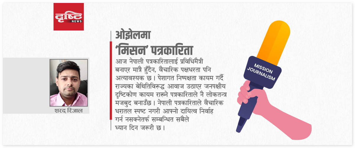 पत्रकारितालाई वैचारिक बहस गर्ने माध्यम भन्दा पनि सतही र लोकप्रियता र अर्थोपार्जनका लागि समाचार सामग्री सम्प्रेषण गर्ने साधनका रुपमा समेत प्रयोग गरिएको छ । यसरी कुनै पनि वैचारिक अडान नलिनुलाई नै निष्पक्षता हो भन्ने गलत धारणाले समेत पत्रकारितालाई क्षेत्रलाई प्रभावित भएको छ । यसमा मिडिया सञ्चालक र राजनीतिक–आर्थिक दबाबको भूमिका पनि कम छैन । ठूला मिडिया हाउसहरू सत्तासँग नजिकिँदा त्यहाँ कार्यरत पत्रकार प्रश्न उठाउन नसक्ने परिस्थिति छ । यस्तो वातावरणमा वैचारिक पत्रकारिता कदापी फस्टाउन सक्दैन।