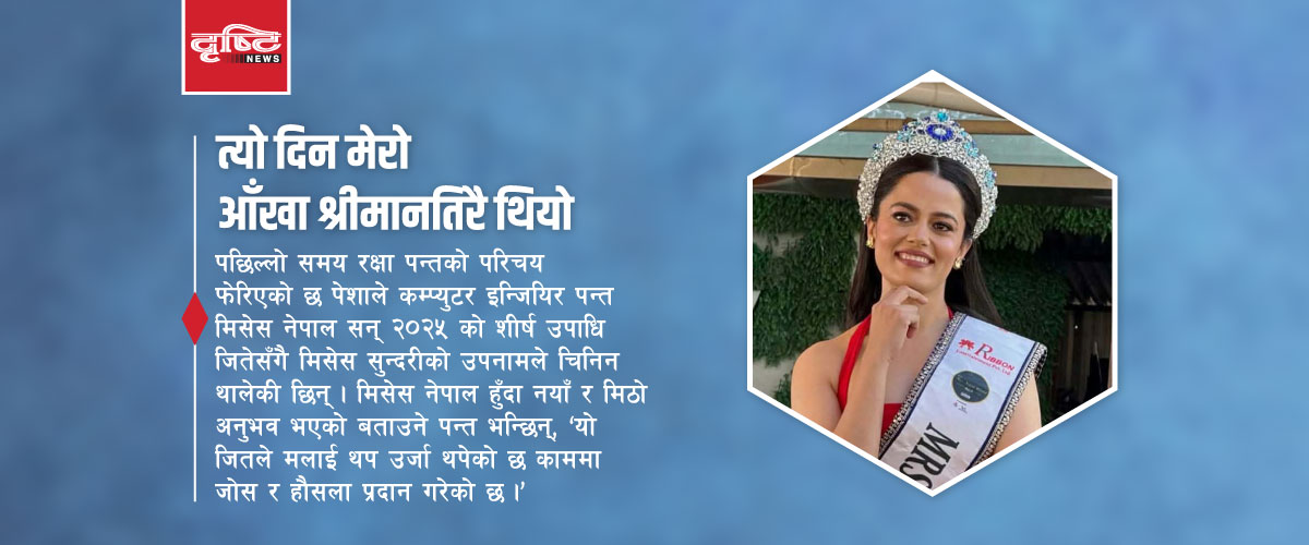 पछिल्लो समय रक्षा पन्तको परिचय फेरिएको छ पेशाले कम्प्युटर इन्जियिर पन्त मिसेस नेपाल सन् २०२५ को शीर्ष उपाधि जितेसँगै मिसेस सुन्दरीको उपनामले चिनिन थालेकी छिन् । मिसेस नेपाल हुँदा नयाँ र मिठो अनुभव भएको बताउने पन्त भन्छिन्, ‘यो जितले मलाई थप उर्जा थपेको छ काममा जोस र हौसला प्रदान गरेको छ ।’ ३१ वर्षीया पन्तले २५ प्रतिस्पर्धीलाई उछिनेर शीर्ष ताज पहिरहन सफल भएकी हुन् । उनै मिसेस नेपाल रक्षा पन्तसँग रेजिना पाण्डेको जम्काभेट ।