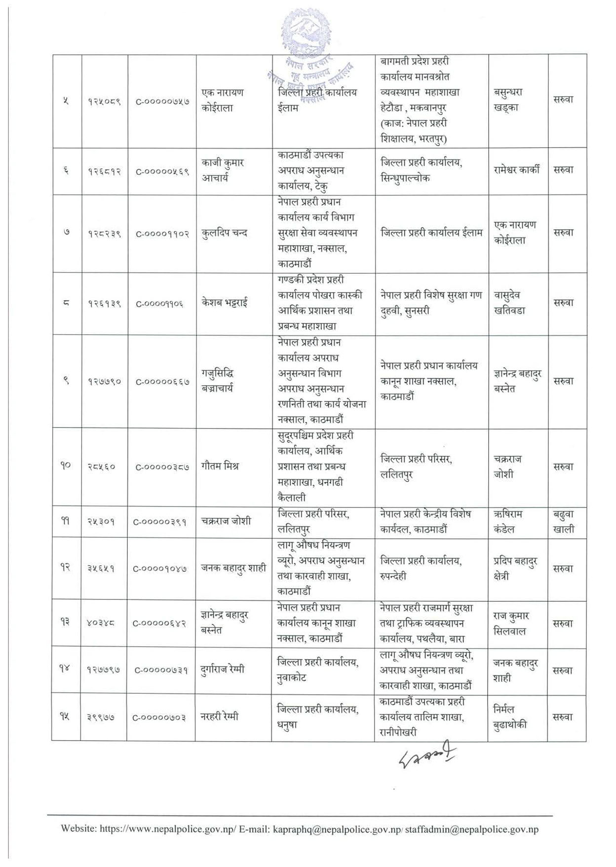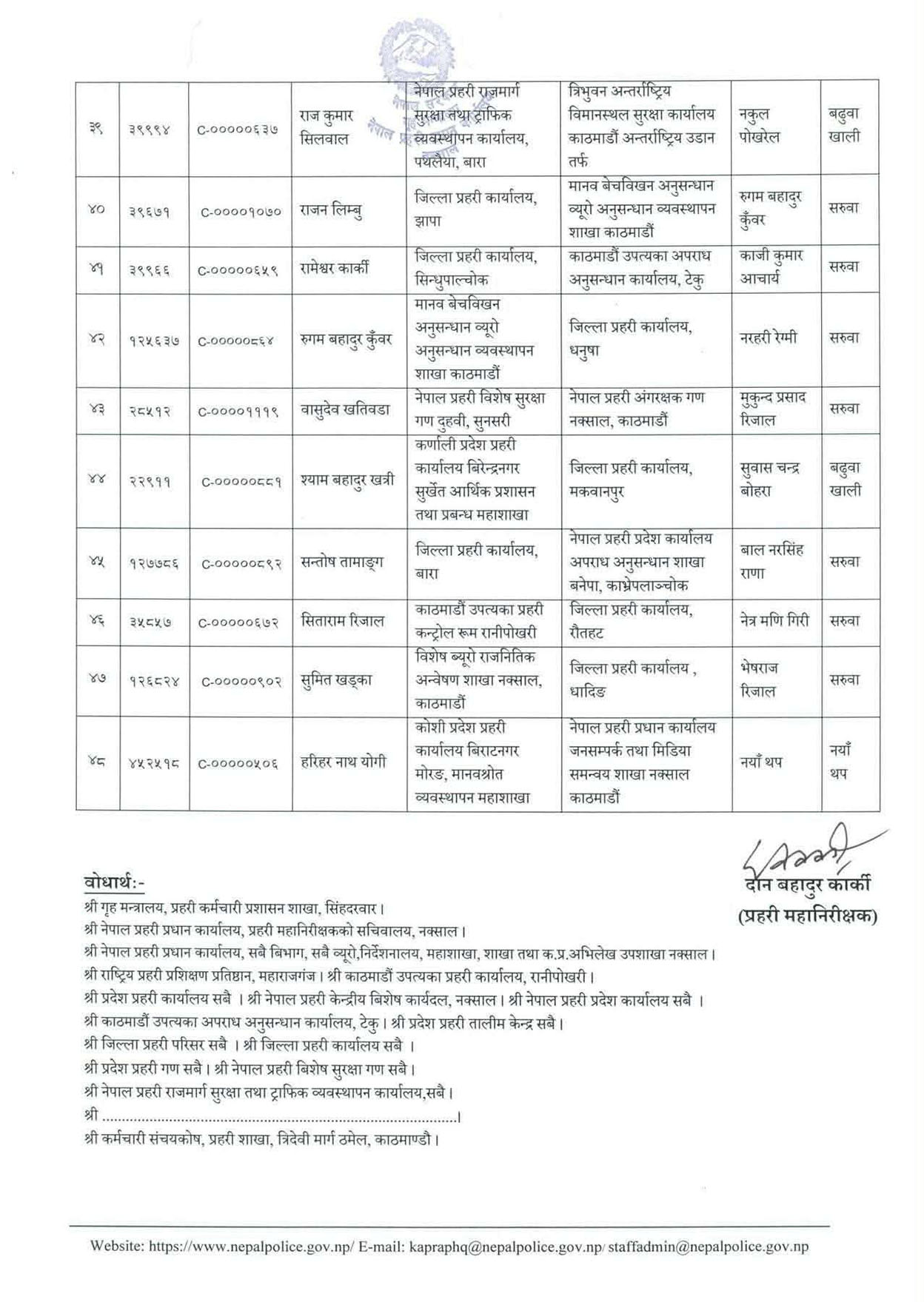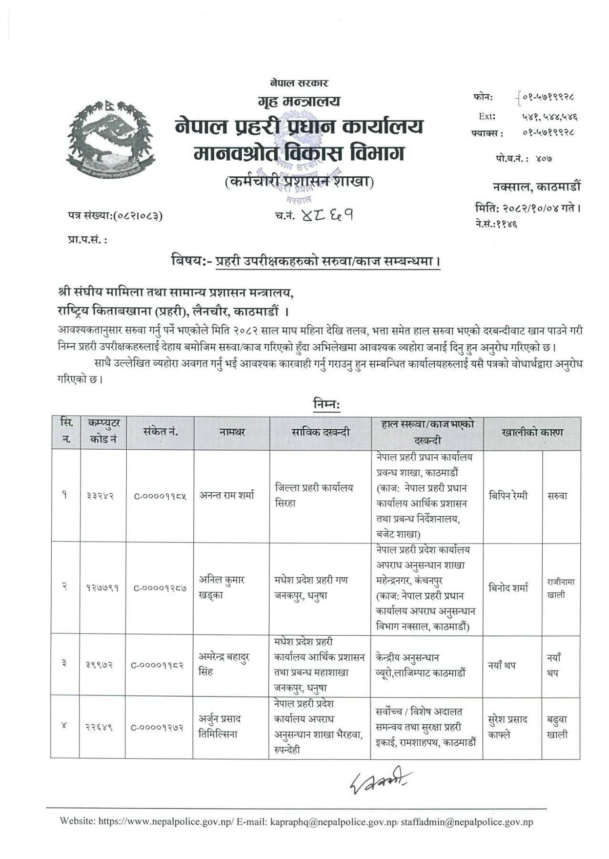 सुदूरपश्चिम प्रदेश प्रहरी कार्यालयको आर्थिक प्रशासन महाशाखामा रहेका गौतम मिश्रलाई जिल्ला प्रहरी परिसर ललितपुर ल्याइएको छ । ललितपुरका प्रहरी प्रमुख चक्रराज जोशीलाई नेपाल प्रहरीको केन्द्रीय विशेष कार्यदलमा पठाइएको छ ।