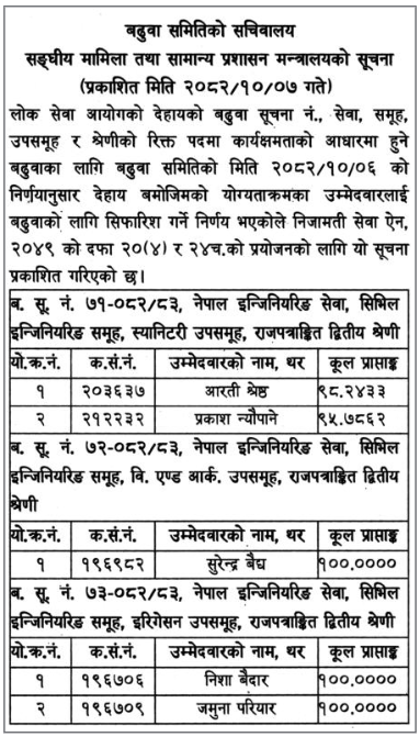 जसमा नेपाल इन्जिनियरिङ सेवा, सिभिल इन्जिनियरिङ समूह, स्यानिटरी उपसमूह (राजपत्रांकित द्वितीय श्रेणी) अन्तर्गत दुई जना, नेपाल इन्जिनियरिङ सेवा, सिभिल इन्जिनियरिङ समूह, वि. एण्ड आर्क. उपसमूह, (राजपत्रांकित द्वितीय श्रेणी) अन्तर्गत एक जना र नेपाल इन्जिनियरिङ सेवा, सिभिल इन्जिनियरिङ समूह, इरिगेसन उपसमूह, (राजपत्रांकित द्वितीय श्रेणी) अन्तर्गत दुई जना शाखा अधिकृतलाई उपसचिव पदमा बढुवा सिफारिस भएका छन् ।