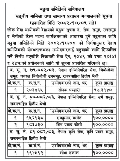 बढुवा समितिको बिहीबारको निर्णयअनुसार नेपाल इन्जिनियरिङ सेवा, जियोलोजी समूह, जनरल जियोलोजी उपसमूह, (राजपत्रांकित द्वितीय श्रेणी) अन्तर्गत एक जना, नेपाल इन्जिनियरिङ सेवा, सर्भे समूह, (राजपत्रांकित द्वितीय श्रेणी) अन्तर्गत दुई जना र नेपाल कृषि सेवा, कृषि प्रसार समूह, (राजपत्रांकित द्वितीय श्रेणी) अन्तर्गत एक जना शाखा अधिकृतलाई उपसचिव पदमा बढुवा सिफारिस गरिएको हो ।