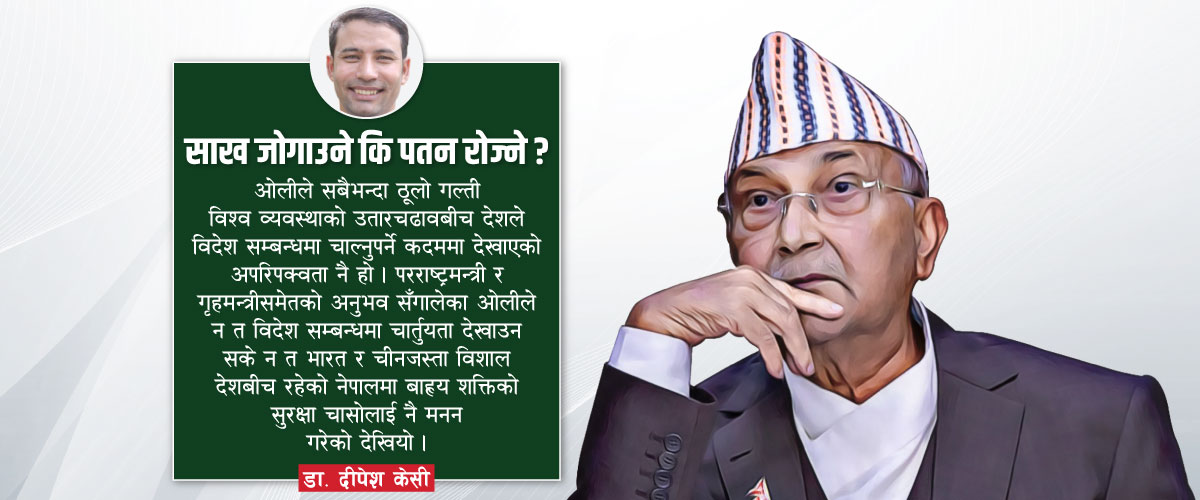 ओलीले सबैभन्दा ठूलो गल्ती विश्व व्यवस्थाको उतारचढावबीच देशले विदेश सम्बन्धमा चाल्नुपर्ने कदममा देखाएको अपरिपक्वता नै हो । परराष्ट्रमन्त्री र गृहमन्त्रीसमेतको अनुभव सँगालेका ओलीले न त विदेश सम्बन्धमा चार्तुयता देखाउन सके न त भारत र चीनजस्ता विशाल देशबीच रहेको नेपालमा बाह्य शक्तिको सुरक्षा चासोलाई नै मनन गरेको देखियो । अमेरिका र चीनबीच विश्वभर तिव्र टकराव बढिरहँदा एमसीसी र बीआरआईको रणनीतिक उद्देश्य गम्भीर थियो ।