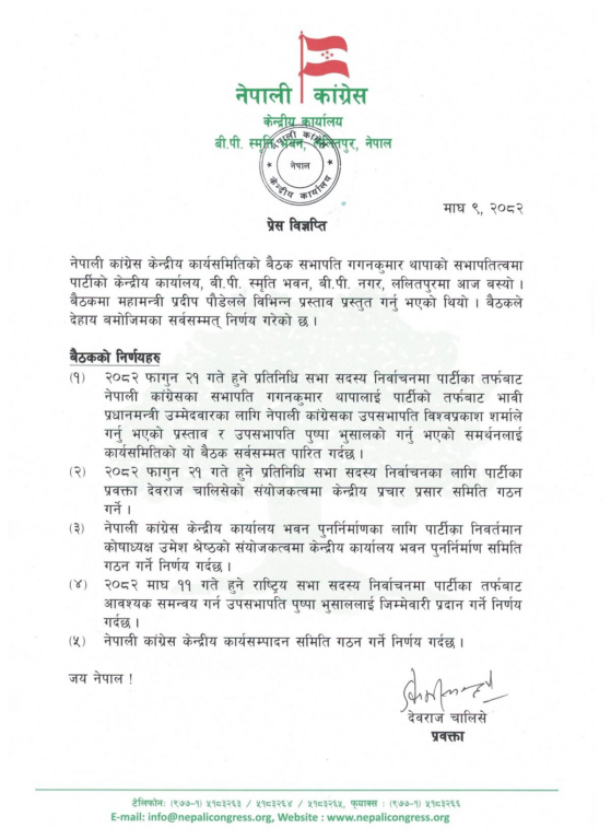 १. २०८२ फागुन २१ गते हुने प्रतिनिधि सभा सदस्य निर्वाचनमा पार्टीका तर्फबाट नेपाली कांग्रेसका सभापति गगनकुमार थापालाई पार्टीको तर्फबाट भावी प्रधानमन्त्री उम्मेदवारका लागि नेपाली कांग्रेसका उपसभापति विश्वप्रकाश शर्माले गर्नु भएको प्रस्ताव र उपसभापति पुष्पा भुसालको गर्नुभएको समर्थनलाई कार्यसमितिको यो बैठक सर्वसम्मत पारित गर्दछ ।