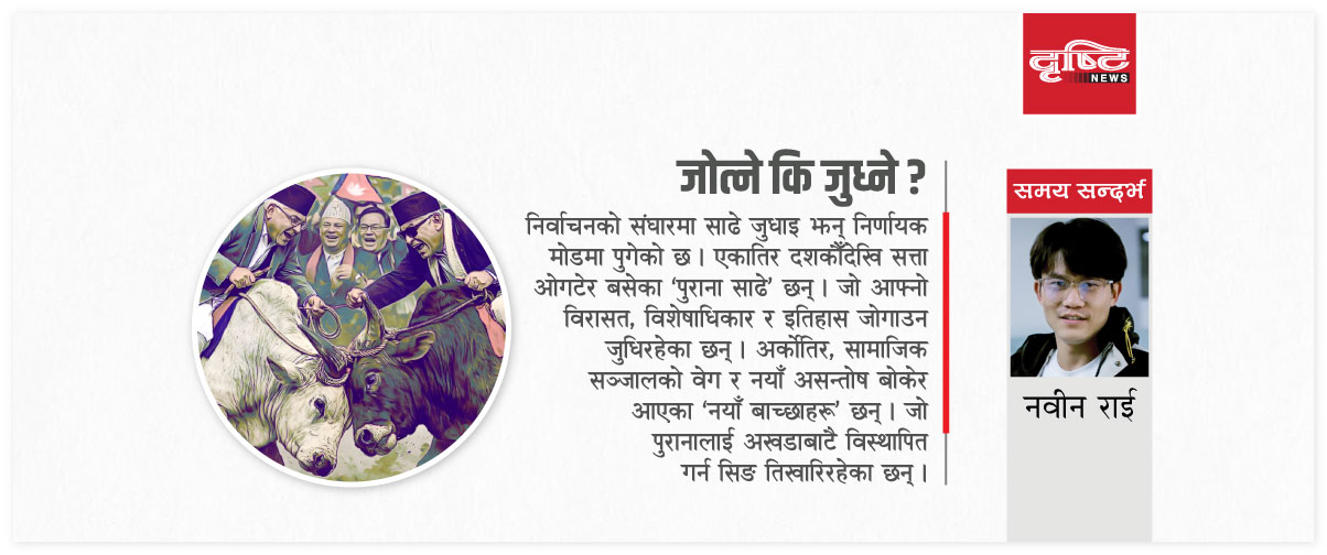 आगामी निर्वाचनको संघारमा यो साढे जुधाइ झन् निर्णायक मोडमा पुगेको छ । एकातिर दशकौँदेखि सत्ता ओगटेर बसेका ‘पुराना साढे’ छन् । जो आफ्नो विरासत, विशेषाधिकार र इतिहास जोगाउन जुधिरहेका छन् । अर्कोतिर, सामाजिक सञ्जालको वेग र नयाँ असन्तोष बोकेर आएका ‘नयाँ बाच्छाहरू’ छन् । जो पुरानालाई अखडाबाटै विस्थापित गर्न सिङ तिखारिरहेका छन् । यो भिडन्त केवल पुस्तान्तरण होइन, नेपाली राजनीतिको आगामी दिशा निर्धारण गर्ने टकराब हो ।
