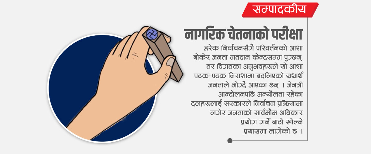 निर्वाचनले केवल सरकार मात्र बनाउँदैन, यसले जनताको इच्छालाई राज्यसत्तामा रूपान्तरण गर्छ भन्ने विश्वव्यापी मान्यतालाई नेपालमा पनि रूपान्तरण गर्न जरुरी छ । निर्वाचन नागरिक चेतनाको परीक्षा पनि हो । मतदाताले उम्मेदवारको नारा होइन, दृष्टिकोण हेर्नुपर्छ, जात, धर्म वा भावनामा होइन, नीति र नैतिकतामा आधारित भएर निर्णय गर्नुपर्छ । जब जनता सचेत हुन्छन् ।
