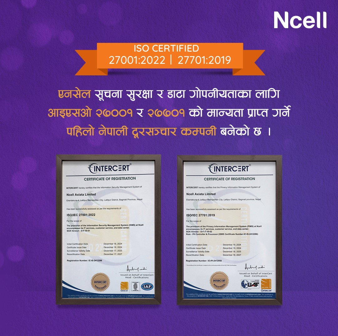काठमाडौं । एनसेलले प्रतिष्ठित आइएसओ २७००१:२०२२ (आइएसएमएस) र २७७०१:२०१९ (पीआइएमएस)को मान्यता पाउन सफल भएको छ। यसले डेटा सुरक्षा र गोपनीयतामा एनसेलको नेतृत्वदायी स्थानलाई थप मजबुत बनाएको छ र ग्राहकहरूको विश्वासका लागि नयाँ मापदण्ड स्थापित गरेको छ।