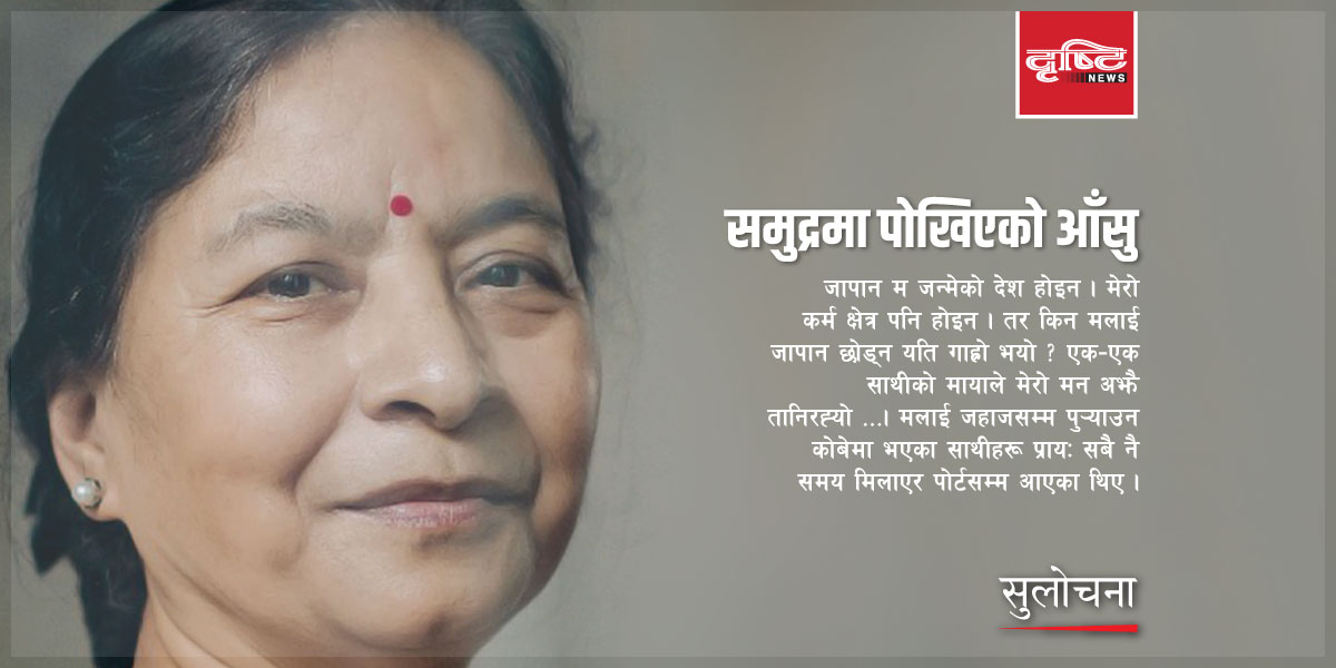 जापान जाँदा शाङ्हाईदेखि योकोहामासम्मको जहाज चढेकी थिएँ । मनमा कौतुहल र रमाइलो थियो । जापानबाट फर्किँदा कोबेको पोर्टमा जहाज चढेँ । मन भारी थियो । साथीहरूको मायासँगै अरू कोसेली पनि थपिएका थिए । प्रत्येक साथीको न्यानो व्यवहार अनि तिरिनसक्नु ऋण पनि थपिएको थियो ।