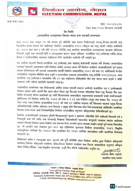 आयोगले बिहीबार प्रेस विज्ञप्ति जारी गर्दै प्रतिनिधिसभा निर्वाचनका क्रममा आचारसंहिता उल्लङ्घनसँग सम्बन्धित कामकारबाहीबारे जानकारी दिएको हो । आयोगले माघ ५ गतेदेखि निर्वाचन आचारसंहिता, २०८२ लागू गरेको थियो ।