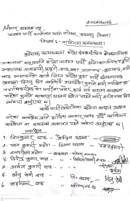 काठमाडौं । सिके राउत नेतृत्वको जनमत पार्टीका केन्द्रीय सदस्य जितकुमार साहसहित ७ जनाले सामूहिक राजीनामा दिएका छन् ।