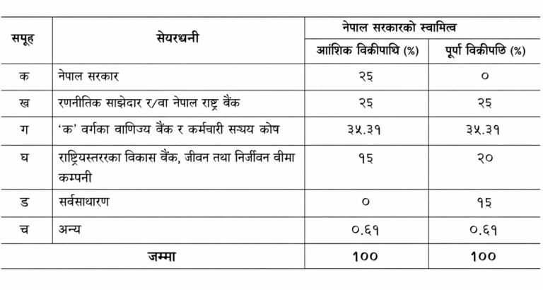 पुनर्संरचना अध्ययन समितिको प्रतिवेदनले पहिलो चरणमा कम्तीमा २० वर्षको अनुभव भएको वैदेशिक रणनीतिक साझेदारलाई १५-२५ प्रतिशत सेयर दिने र दोस्रो चरणमा निजी क्षेत्र तथा सर्वसाधारणका लागि सेयर जारी गर्न सुझाव दिएको छ ।