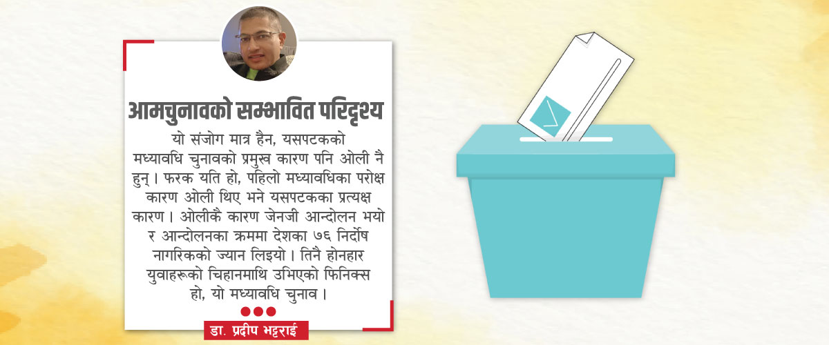 यो संजोग मात्र हैन, यसपटकको मध्यावधि चुनावको प्रमुख कारण पनि ओली नै हुन् । फरक यति हो, पहिलो मध्यावधिका परोक्ष कारण ओली थिए भने यसपटकका प्रत्यक्ष कारण । ओलीकै कारण जेनजी आन्दोलन भयो र आन्दोलनका क्रममा देशका ७६ निर्दोष नागरिकको ज्यान लिइयो । तिनै होनहार युवाहरूको चिहानमाथि उभिएको फिनिक्स हो, यो मध्यावधि चुनाव ।