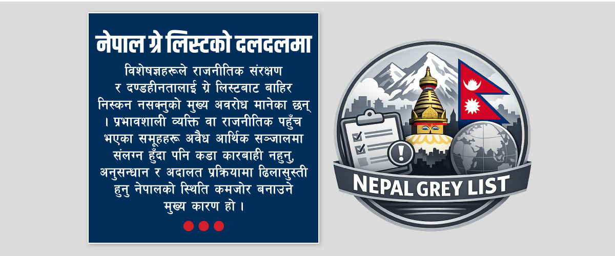 काठमाडौं । नेपाल सम्पत्ति शुद्धीकरण निगरानी सूची ‘ग्रे लिस्ट’मा परेपछि त्यसबाट बाहिर निस्कन सरकारका लागि अझै चुनौतीपूर्ण बनेको छ । यद्यपि, सरकारले औपचारिक रूपमा सुधारको प्रतिवद्धता दोहो¥याइरहेको छ, व्यवहारमा ढिलासुस्ती, कमजोर कार्यान्वयन र राजनीतिक हस्तक्षेपका कारण मुलुक अझै ग्रे लिस्टको दलदलमै अड्किएको देखिन्छ ।