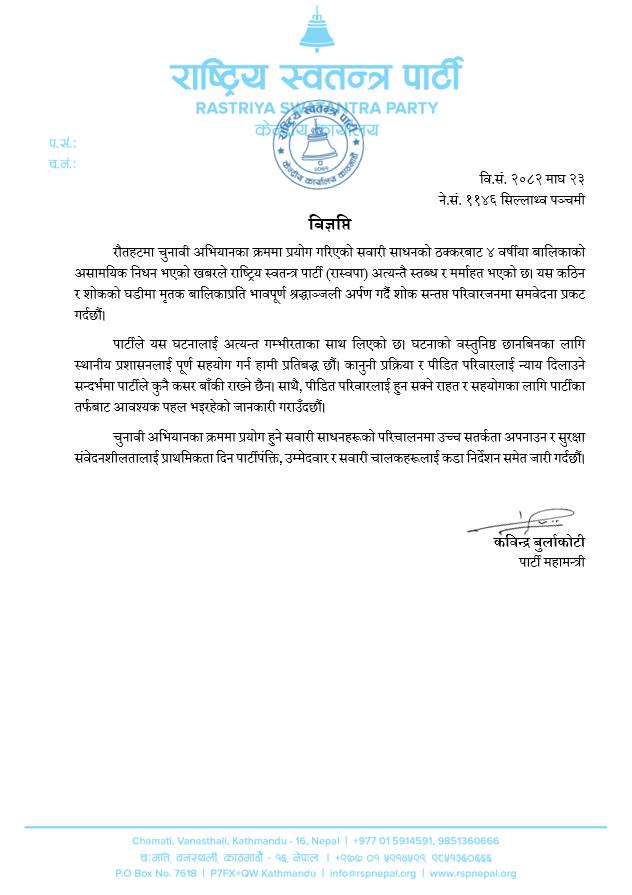 ‘रौतहटमा चुनावी अभियानका क्रममा प्रयोग गरिएको सवारी साधनको ठक्करबाट ४ वर्षीया बालिकाको असामयिक निधन भएको खबरले राष्ट्रिय स्वतन्त्र पार्टी (रास्वपा) अत्यन्तै स्तब्ध र मर्माहत भएको छ,’ विज्ञप्तिमा भनिएको छ । विज्ञप्तिमा शोकको घडीमा मृतक बालिकाप्रति भावपूर्ण श्रद्धाञ्जली अर्पण गर्दै शोकसन्तप्त परिवारजनमा समवेदना प्रकट गरिएको छ ।