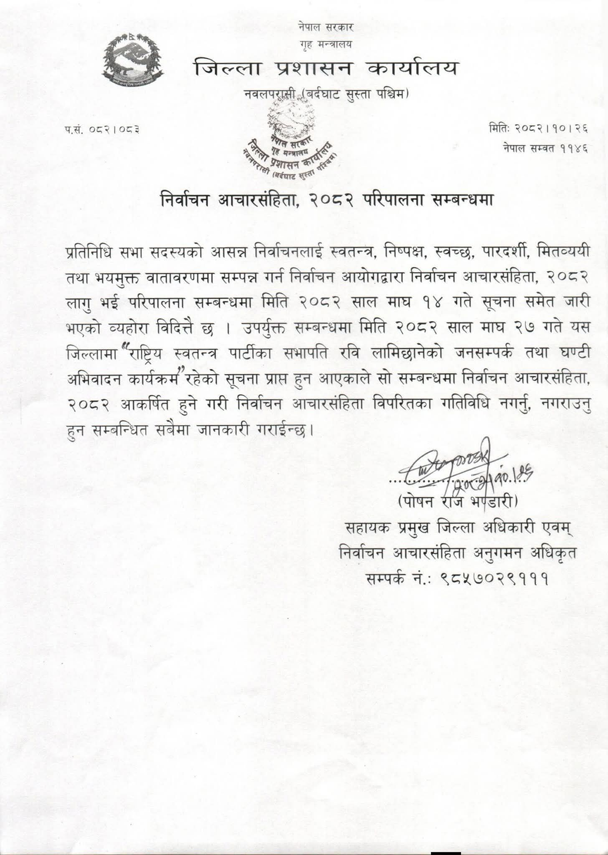यसै सन्दर्भमा सहायक प्रमुख जिल्ला अधिकारी तथा आचारसंहिता अनुगमन अधिकृत पोषणराज भण्डारीले प्रतिनिधिसभा सदस्यको आसन्न निर्वाचनलाई निष्पक्ष र मर्यादित बनाउन रास्वपाले सञ्चालन गरेको ‘जनसम्पर्क तथा घण्टी अभिवादन’ कार्यक्रम आचारसंहिता प्रतिकूल हुने स्पष्ट पारेका छन् ।