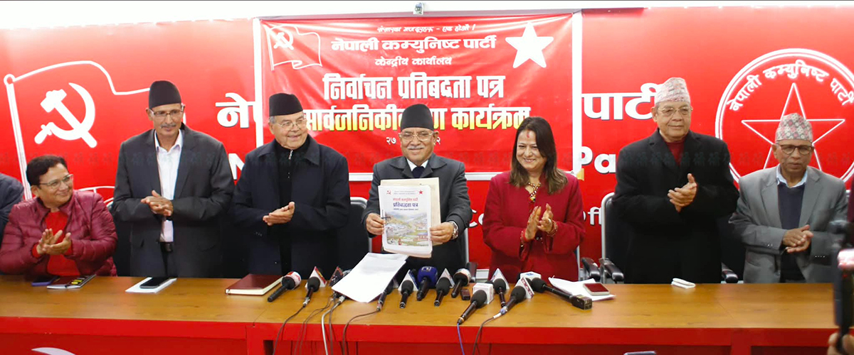 काठमाडौं । नेपाली कम्युनिष्ट पार्टीले प्रतिबद्धता पत्र सार्वजनिक गरेको छ । संयोजक पुष्पकमल दाहाल ‘प्रचण्ड’ले प्रतिबद्धता पत्र सार्वजनिक गरेका हुन् ।