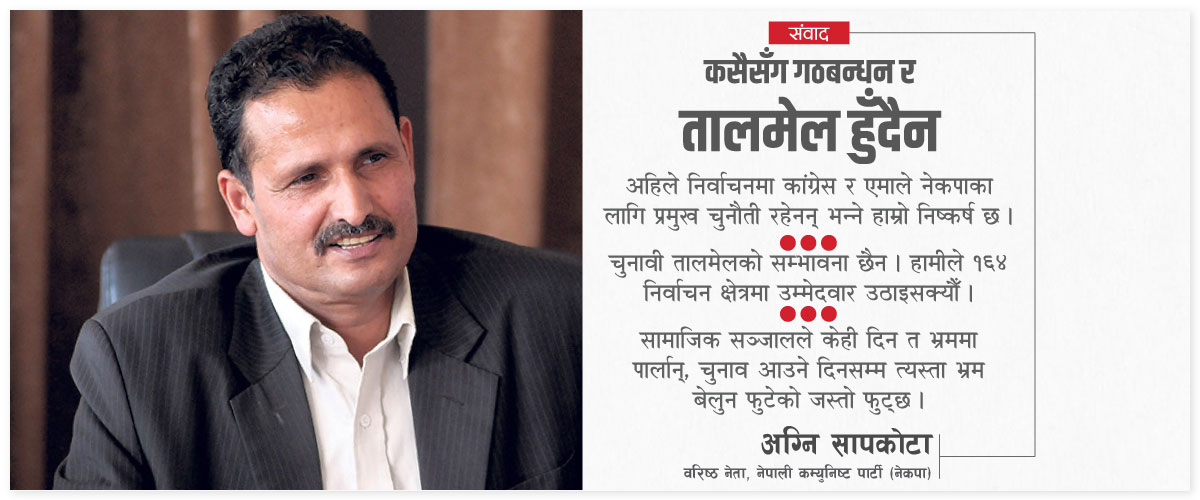 विगतका कमजोरी स्विकार्दै आत्मआलोचना गरिएको र जनतासँग पुनः सम्बन्ध मजबुत बनाइएको दाबी नेकपाको छ । चुनावी तालमेल गर्ने पक्षमा नेकपा देखिएको छैन । नेकपाले १६४ निर्वाचन क्षेत्रमा उम्मेदवार उठाएको छ । चुनावी रणनीति, एजेन्डा, वैचारिक स्पष्टता र चुनौतीका विषयमा नेपाली कम्युनिष्ट पार्टी (नेकपा)का वरिष्ठ नेता एवं प्रचार संयोजक अग्नि सापकोटासँग दृष्टिले गरेको कुराकानीको सम्पादित अंश ।