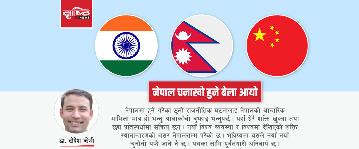 भारत र चीन जस्तो तीव्र आर्थिक वृद्धि र सैन्य शक्ति बनाइरहेका देशहरूको बीचमा छ नेपाल । एकातर्फ भारत र चीन नै प्रतिस्पर्धामा छन् । अर्कोतर्फ, तीव्र गतिमा पश्चिमबाट पूर्वतर्फ स्थानान्तरण भइरहेको शक्तिका कारण भारत र चीन नै चुनौतीको सामना गरिरहेछन् । यसको असर नेपालमा पनि परिरहेको छ । नेपालमा हुने गरेका ठुलो राजनीतिक घटनालाई नेपालको आन्तरिक मामिला मात्र हो भन्नु आलोकाँचो बुझाइ भन्नुपर्छ ।