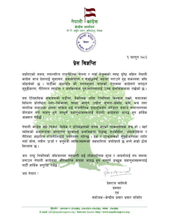 ‘कांग्रेस सधैँ विचार, विवेक र प्रतिबद्धताको सङ्गम भएको लोकतान्त्रिक मञ्च हो, यहाँ व्यक्तिको क्षमताभन्दा संस्थागत मूल्यलाई प्राथमिकता दिइन्छ। पारदर्शिता, जबाफदेहिता र नीतिमा आधारित राजनीतिलाई अवलम्बन गरिन्छ। देश र लोकतन्त्रको सुदृढीकरणका लागि नयाँ सोच, नवीन ऊर्जा र अनुभवी व्यक्तित्वहरूको सहभागिता अपरिहार्य छ भन्ने हाम्रो विश्वास छ’, विज्ञप्तिमा भनिएको छ ।