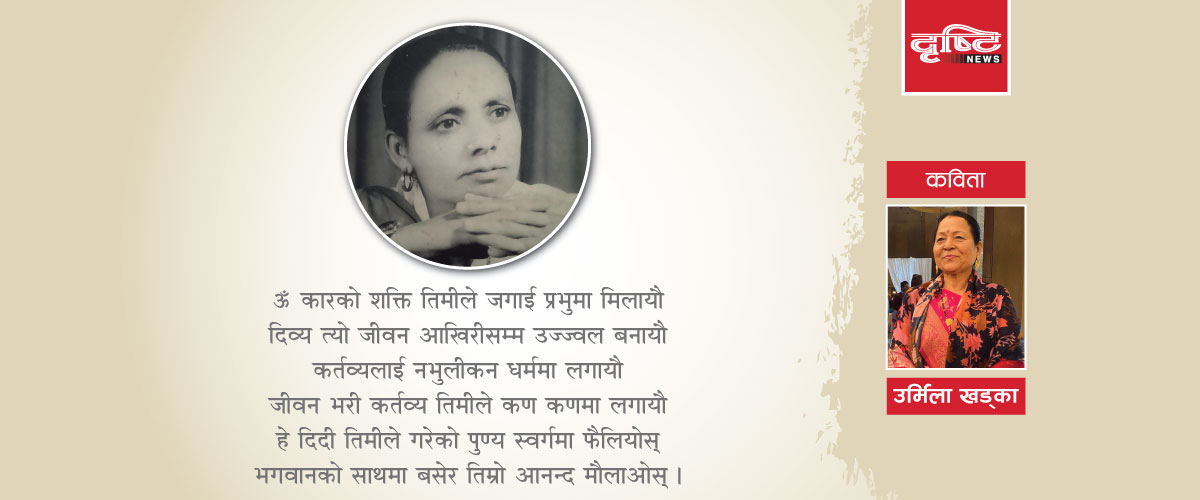 ठूली जेठानी दिदी निर्मला खड्काको स्वर्गारोहण भएको दुखद घडीमा अत्यन्त मर्माहत भएका छौँ । दिदी, हजुरको वैकुण्ठमा बास होस् भनी भावपूर्ण श्रद्धाञ्जली अर्पण गर्दछु ।