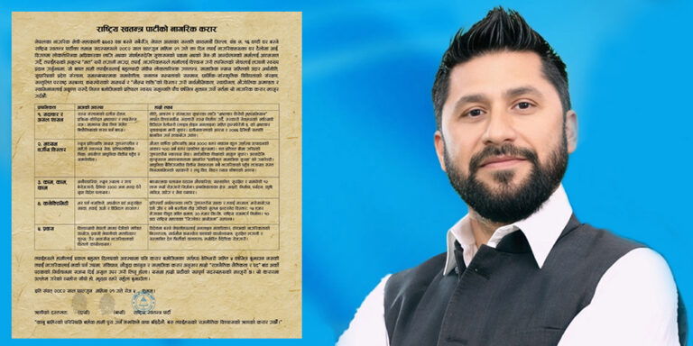 काठमाडौं । राष्ट्रिय स्वतन्त्र पार्टी (रास्वपा) ले आसन्न निर्वाचनका लागि नागरिक करारपत्र सार्वजनिक गरेको छ । पार्टीले आफ्ना प्राथमिकता, वर्तमान अवस्था र लक्ष्य समेटिएका बुँदासहित करारपत्र सार्वजनिक गरेको हो ।
