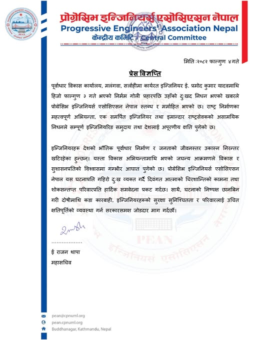 एमाले निकट प्रोग्रेसिभ इन्जिनियर्स एसोसिएसन नेपाल (पिन)ले संघीय निर्वाचनलाई लक्षित गर्दै सम्बन्धित निर्वाचन क्षेत्रमा समन्वय, रणनीतिक सहयोग तथा प्राविधिक सल्लाह प्रदान गर्ने जिम्मेवारीसहित फिल्डमा खटाएको हो ।