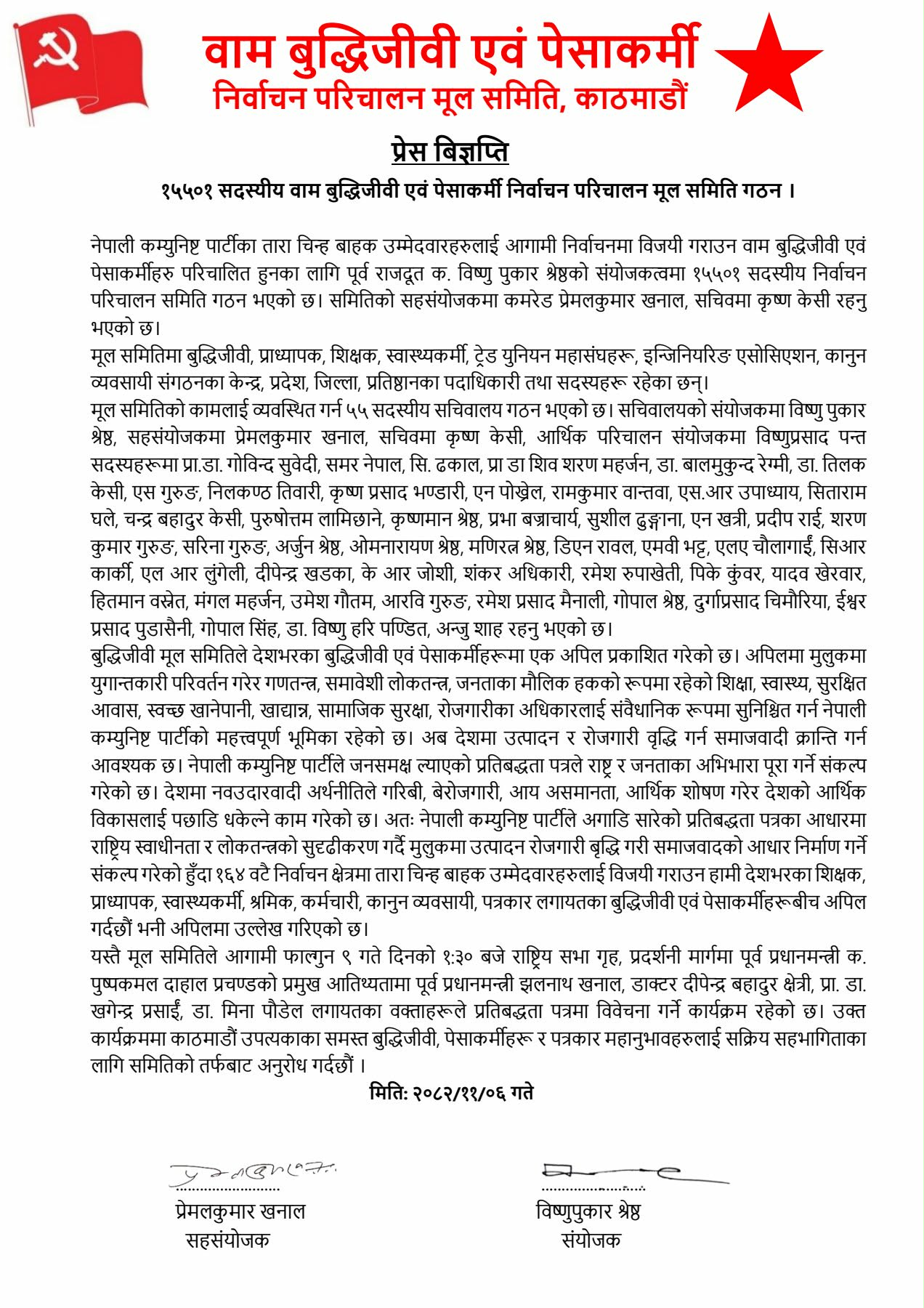 काठमाडौं । आगामी निर्वाचनमा नेपाली कम्युनिष्ट पार्टीका उम्मेदवारहरूलाई विजयी गराउन ‘वाम बुद्धिजीवी एवं पेसाकर्मी निर्वाचन परिचालन मूल समिति’ गठन गरिएको छ ।