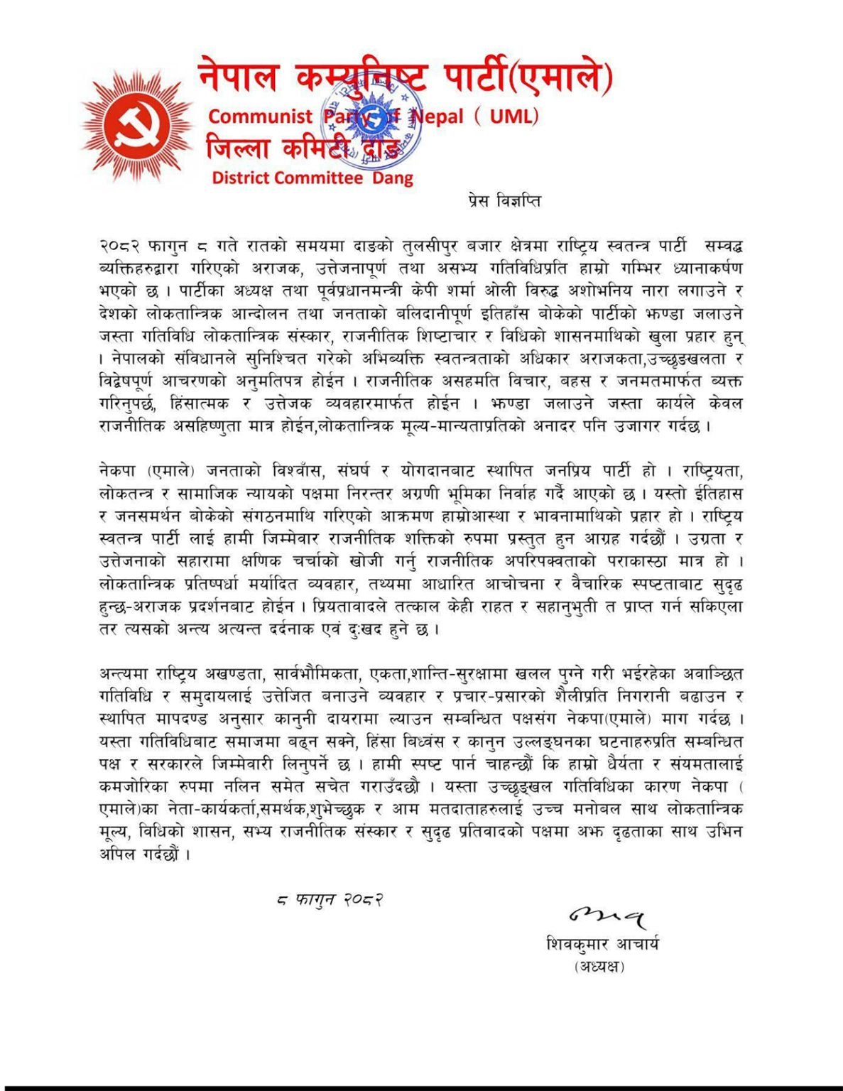 बिहीबार राति तुलसीपुर बजार क्षेत्रमा रास्वपा समर्थकले एमालेका झण्डामा आगजनी गर्नुका साथै ‘ओली चोर देश छोड भन्दै’ नाराबाजी गरेका थिए । एमाले जिल्ला अध्यक्ष शिवकुमार आचार्यले विज्ञप्ति जारी गरेर यस कार्यलाई लोकतान्त्रिक संस्कार, राजनीतिक शिष्टाचार र कानुनी शासनमाथिको खुला प्रहारको रूपमा चित्रण गरेको उल्लेख गरेका छन् ।